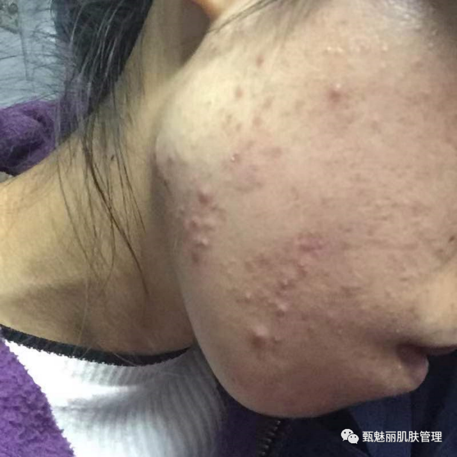 3、如果你的闭口,长满全脸,包括不太出油的脸颊,那么你要考虑是不是饮食,情绪,或者是你不注意补水等原因。